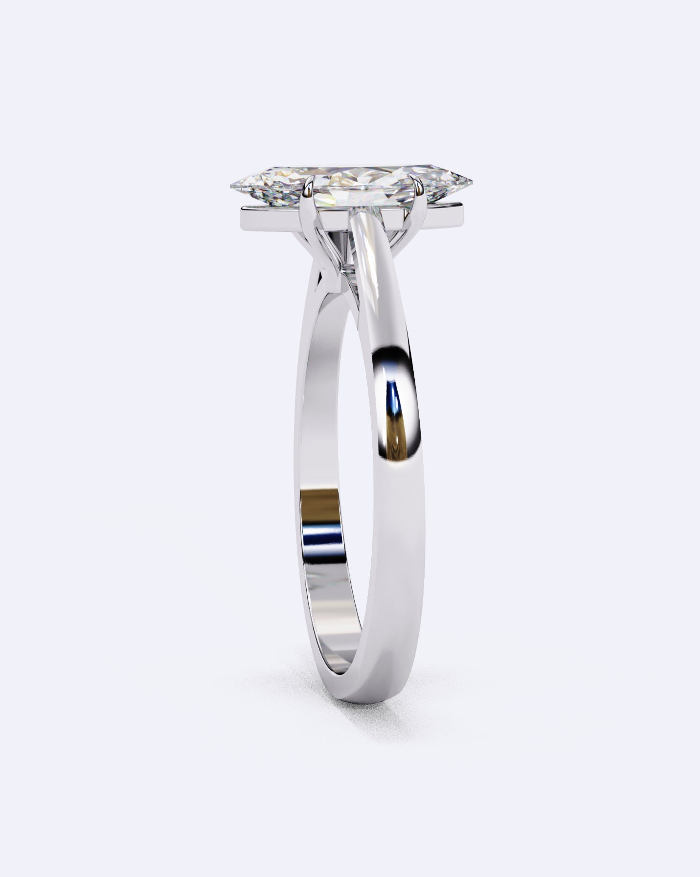 A timeless marquise-cut solitaire sits gracefully at the center, creating an elongated, elegant silhouette that enhances sparkle and flatters every hand. Sophisticated, minimal, and forever in style.