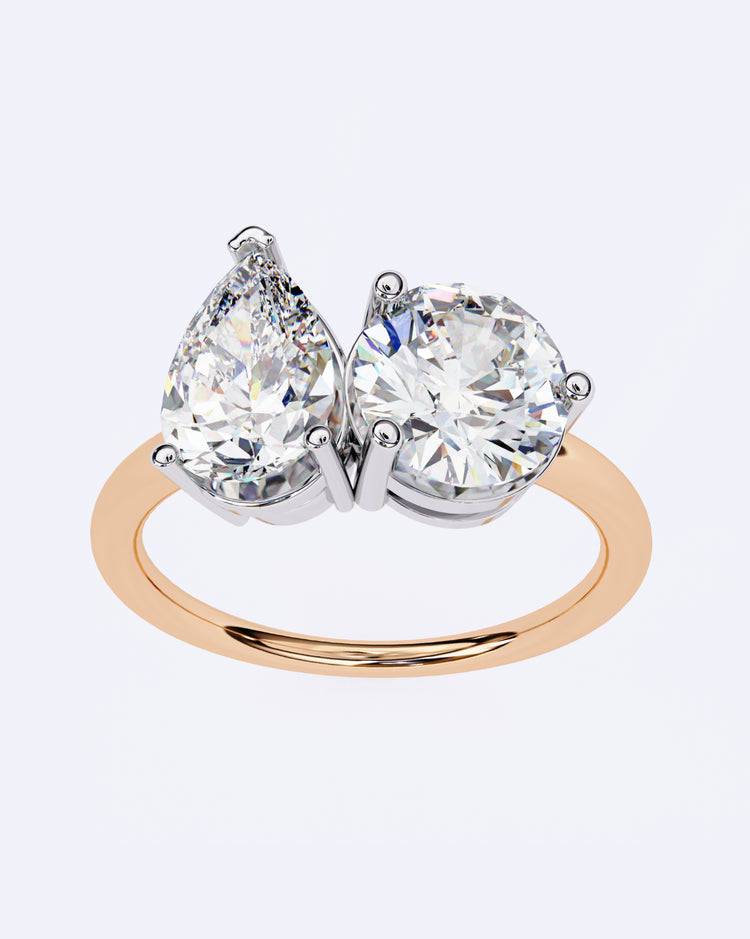 A brilliant round diamond pairs effortlessly with a graceful pear-shaped solitaire, creating a beautiful contrast of symmetry and soft curves. A modern yet timeless design that symbolizes balance and togetherness.