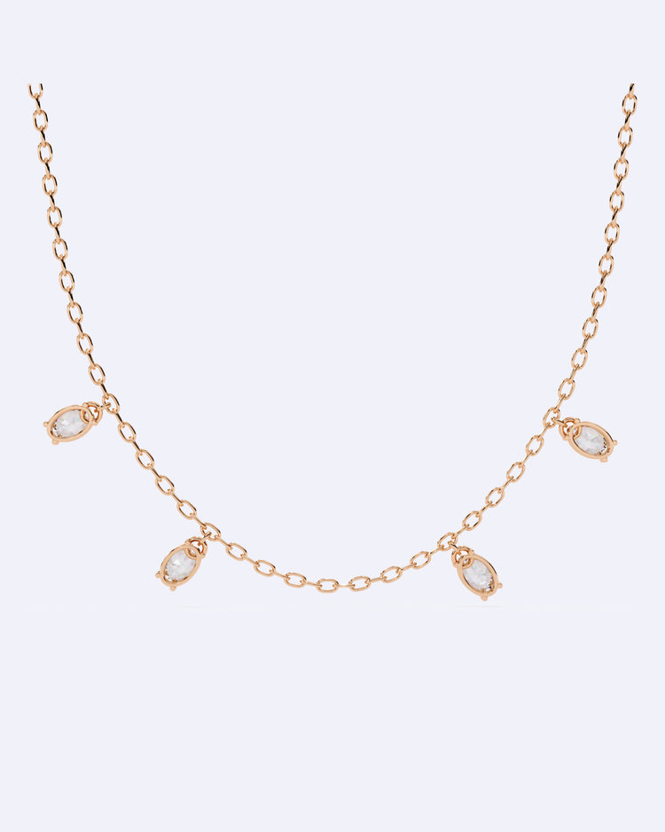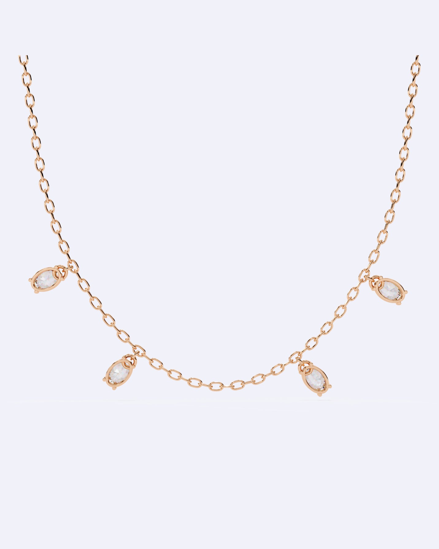 A graceful single-line chain necklace featuring beautifully set oval solitaire diamonds, designed to add a touch of refined brilliance to any look.