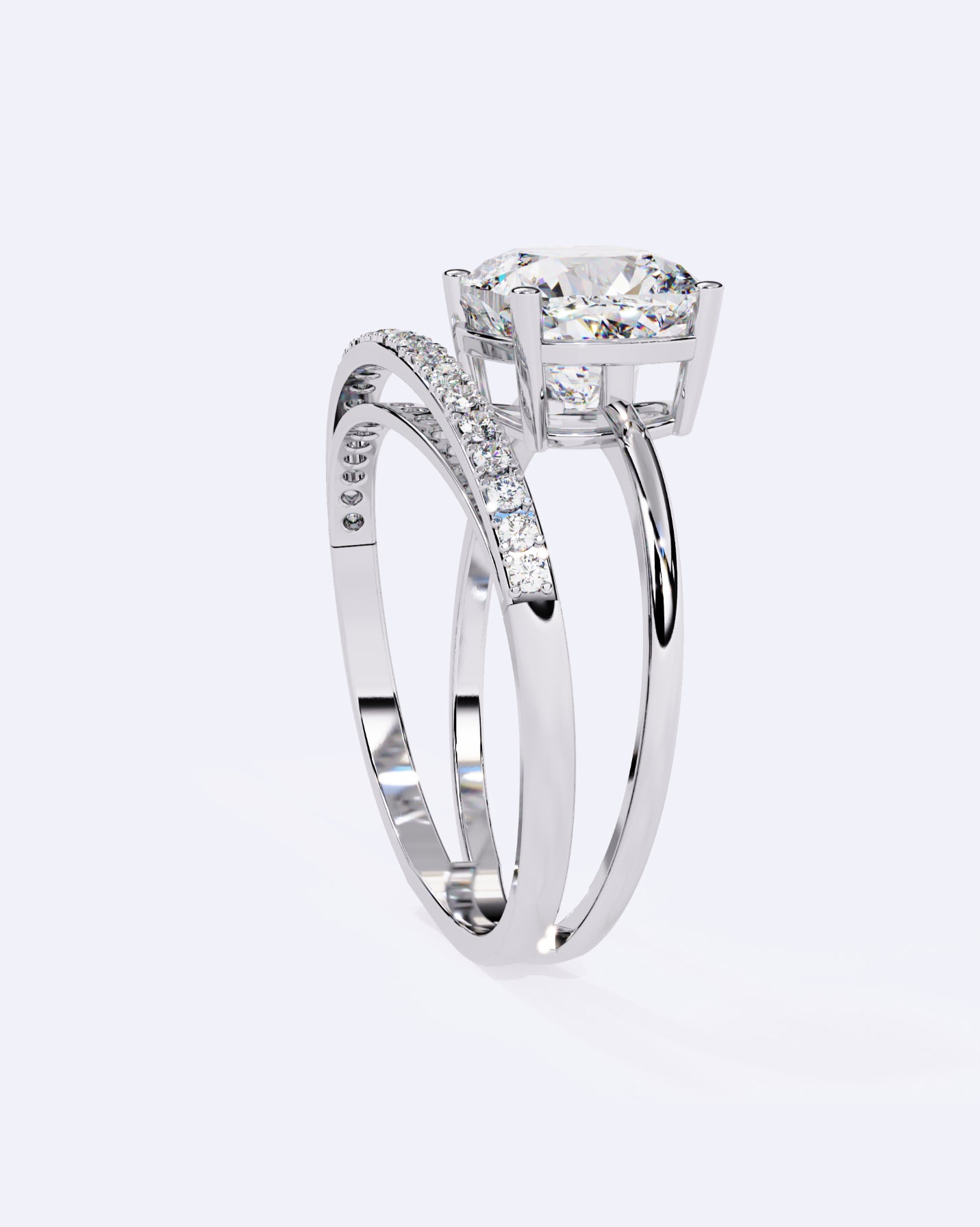 A radiant cushion-cut solitaire ring and a classic diamond eternity band are beautifully linked together, symbolizing a bond that lasts forever. Worn as one, the duo blends sparkling brilliance with timeless romance — a perfect pairing for a love that’s inseparable.