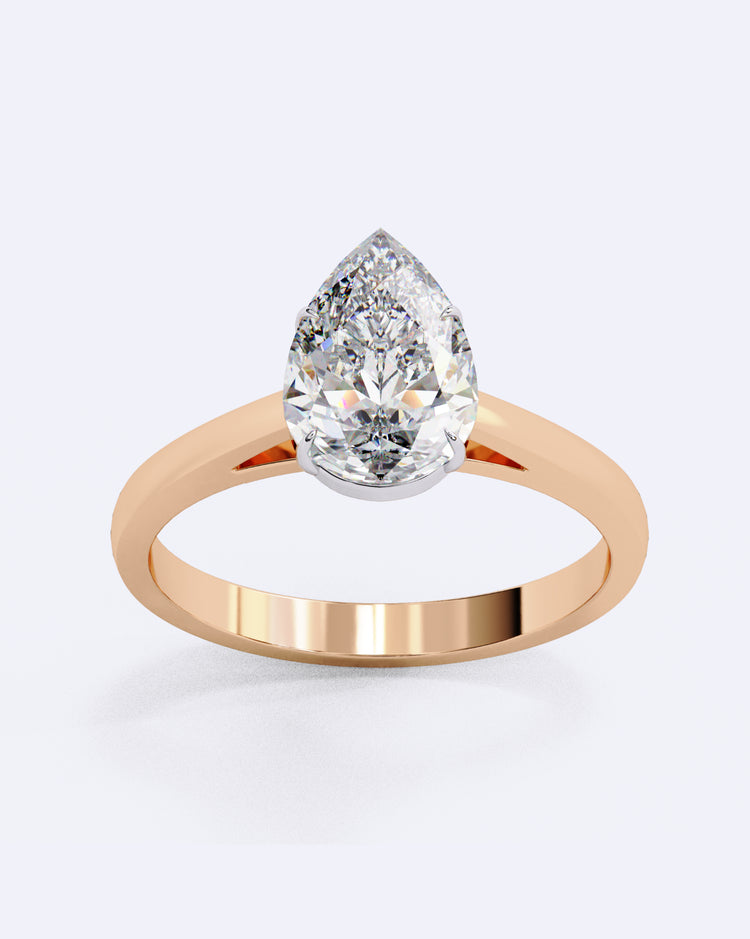 A stunning pear-shaped diamond solitaire ring designed to elongate the finger with its graceful teardrop silhouette. Sparkling with timeless elegance, it blends modern charm and classic romance in one iconic piece.