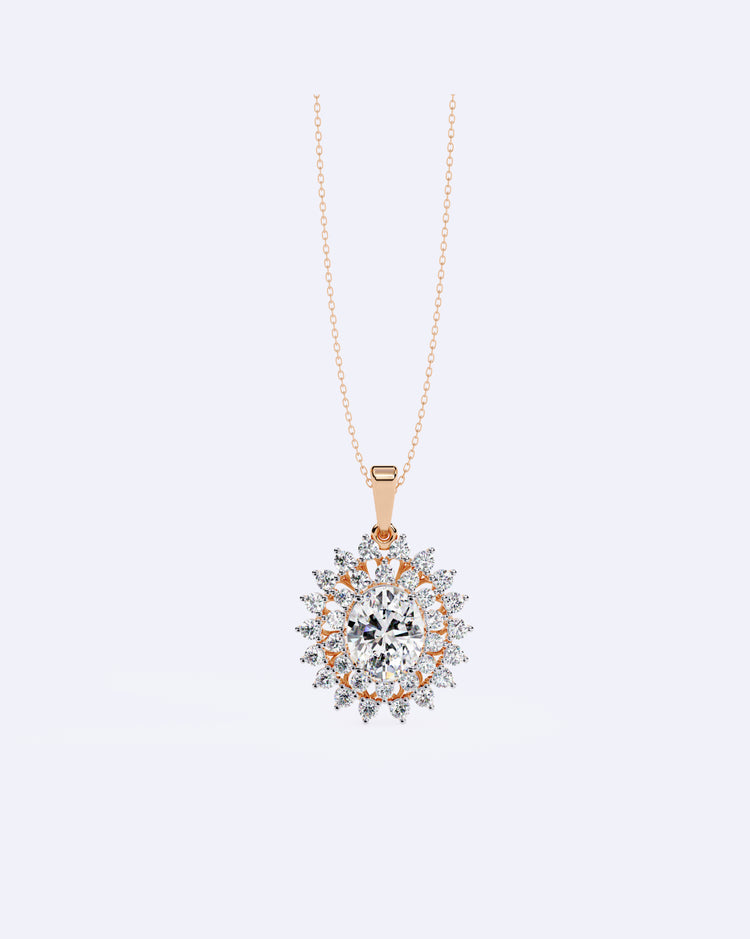 A stunning pendant featuring an oval solitaire diamond highlighted with a delicate outline of smaller diamonds arranged like sunrays, creating a radiant and timeless sparkle.