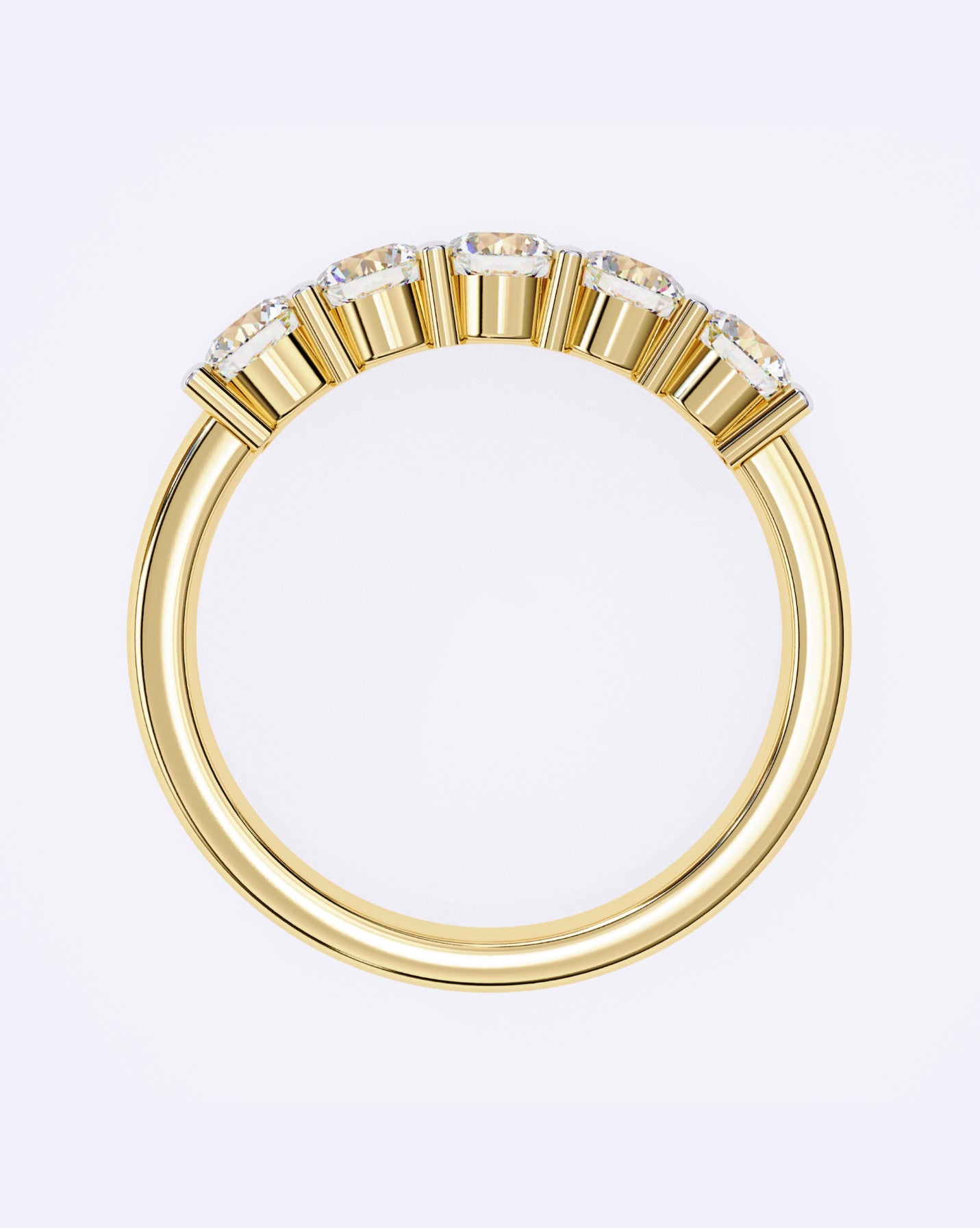 An elegant band featuring five radiant solitaire diamonds set in perfect symmetry, offering a refined sparkle that’s timeless, versatile, and effortlessly luxurious.