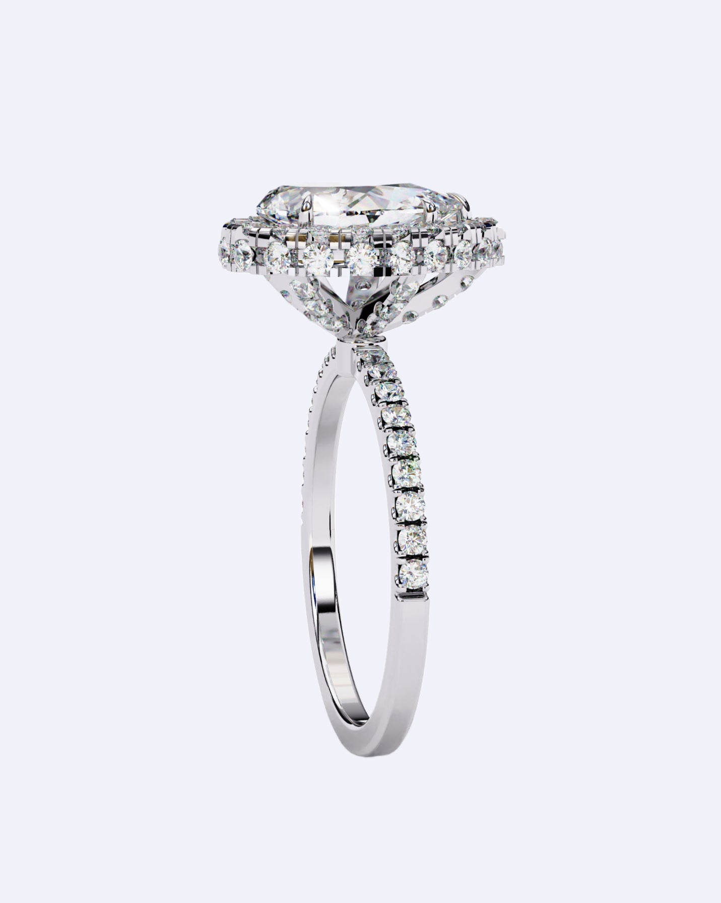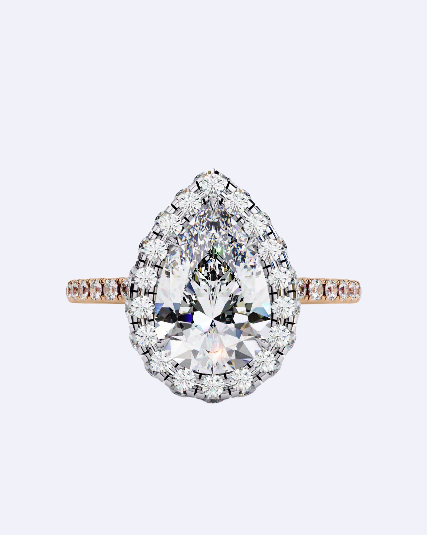 A stunning pear-shaped solitaire takes center stage, surrounded by a sparkling halo of small diamonds and paired with diamond accents along the band a timeless and romantic design that radiates brilliance from every angle.