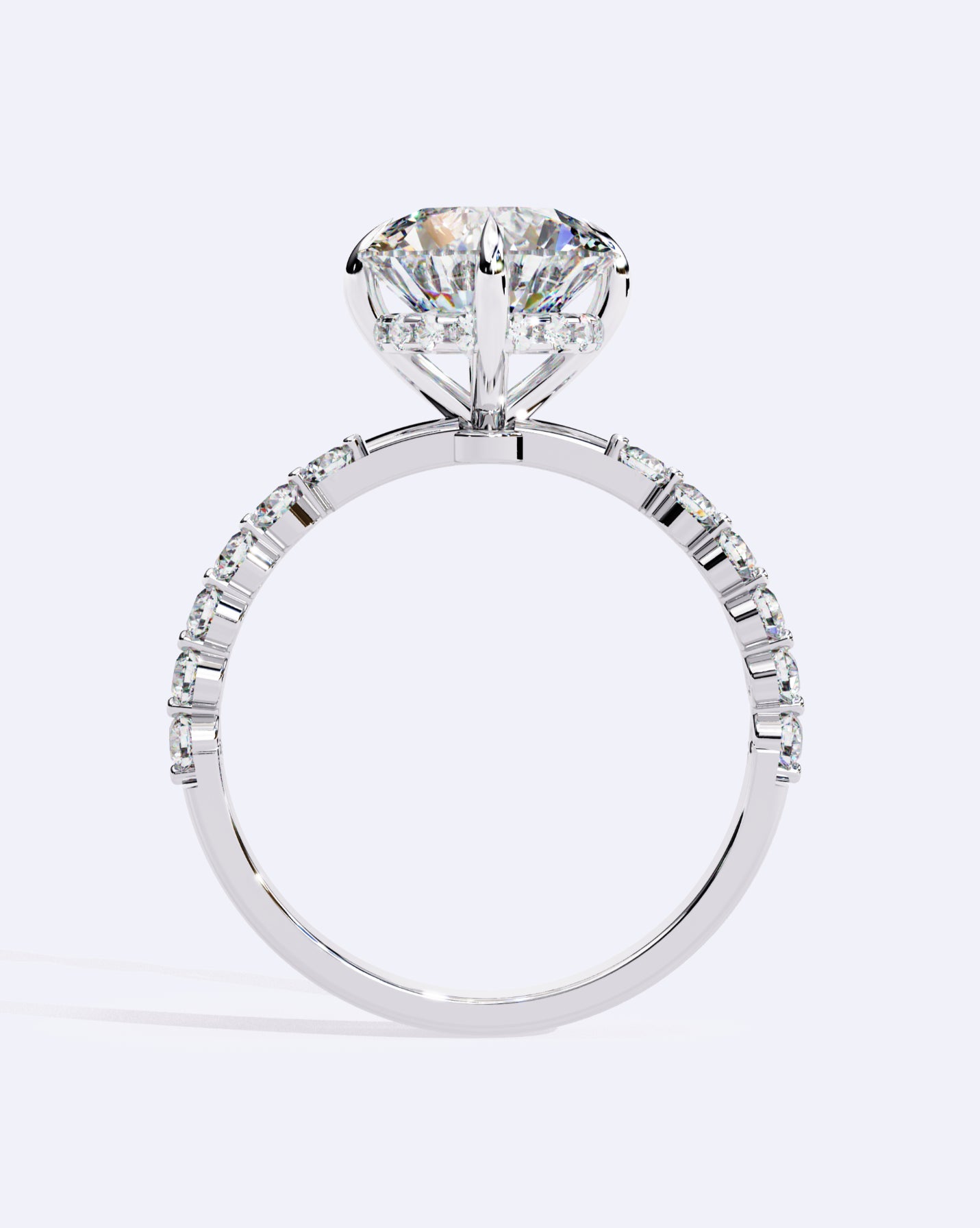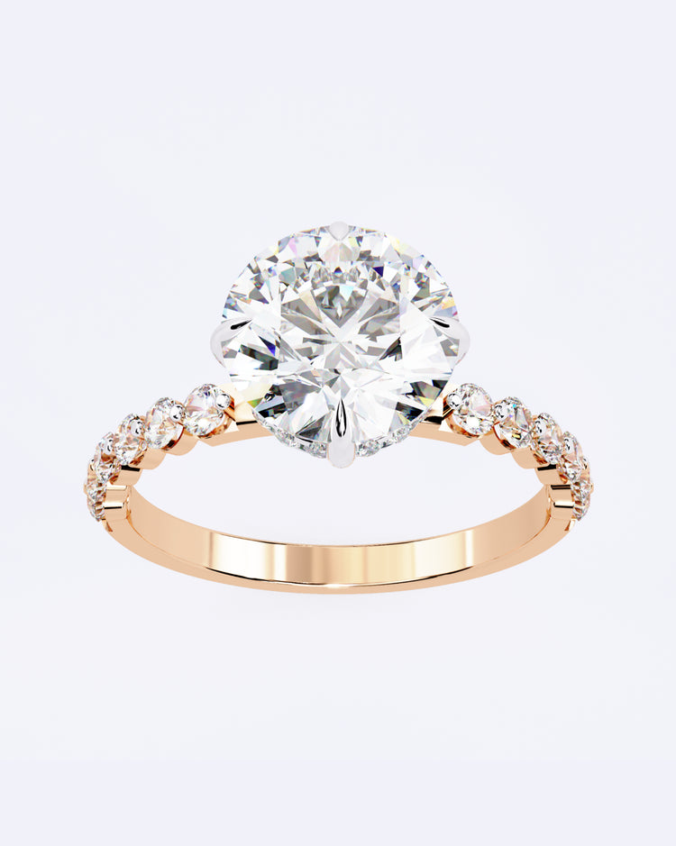 A timeless round solitaire sparkles at the center, elevated with delicate diamonds set along the band for a touch of added brilliance. Classic elegance with a modern refined finish.
